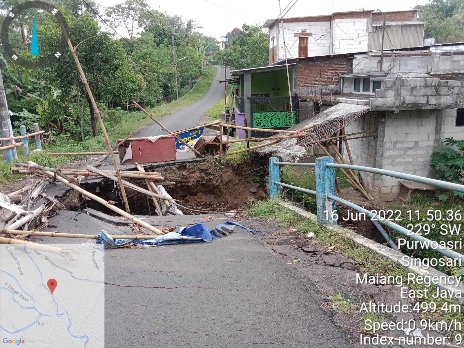 Jembatan penghubung desa Purwoasri ke Desa Purworejo Kecamatan Singosari Kabupaten Malang Mengalami rusak berat dan ambles akibat kontruksinya tergerus air sungai saat terjadi hujan.