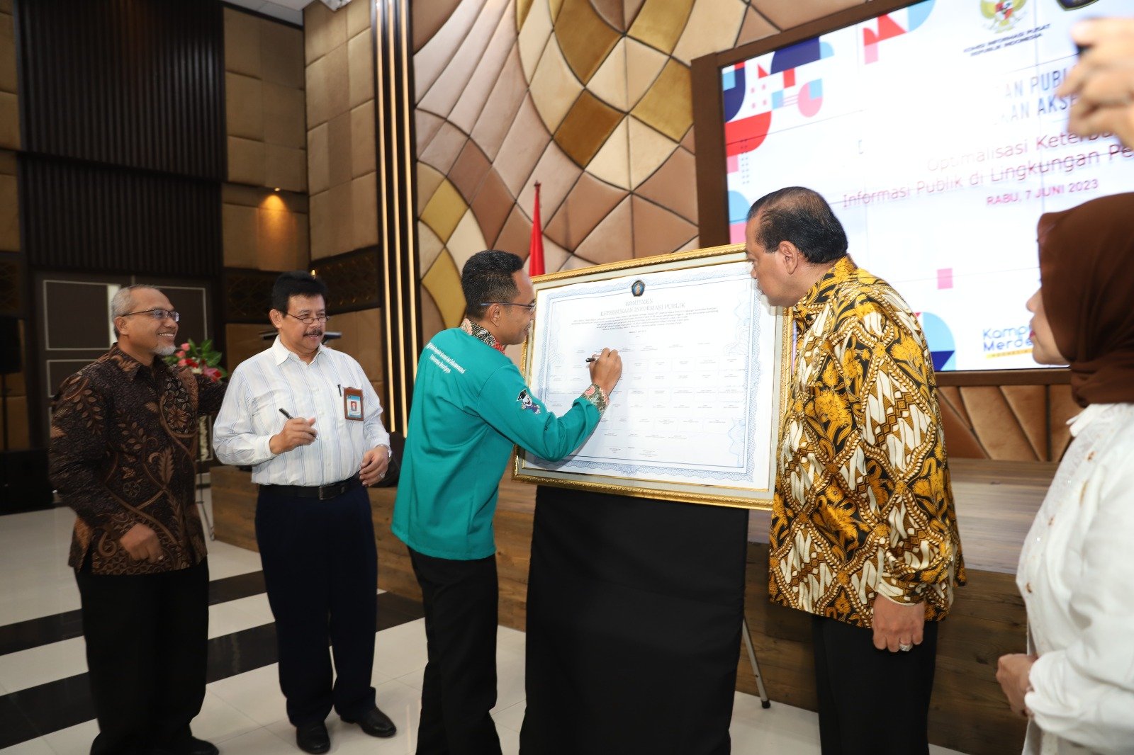 Seluruh jajaran pimpinan Universitas Brawijaya (UB) mulai dari Rektor, Wakil Rektor, Sekretaris Universitas, Dekan, Direktur, Kepala Lembaga, Kepala UPT, Kepala Divisi menandatangani perjanjian Komitmen Keterbukaan Informasi Publik, Rabu (07/06/2023), di gedung Algoritma Fakultas Ilmu Komputer.