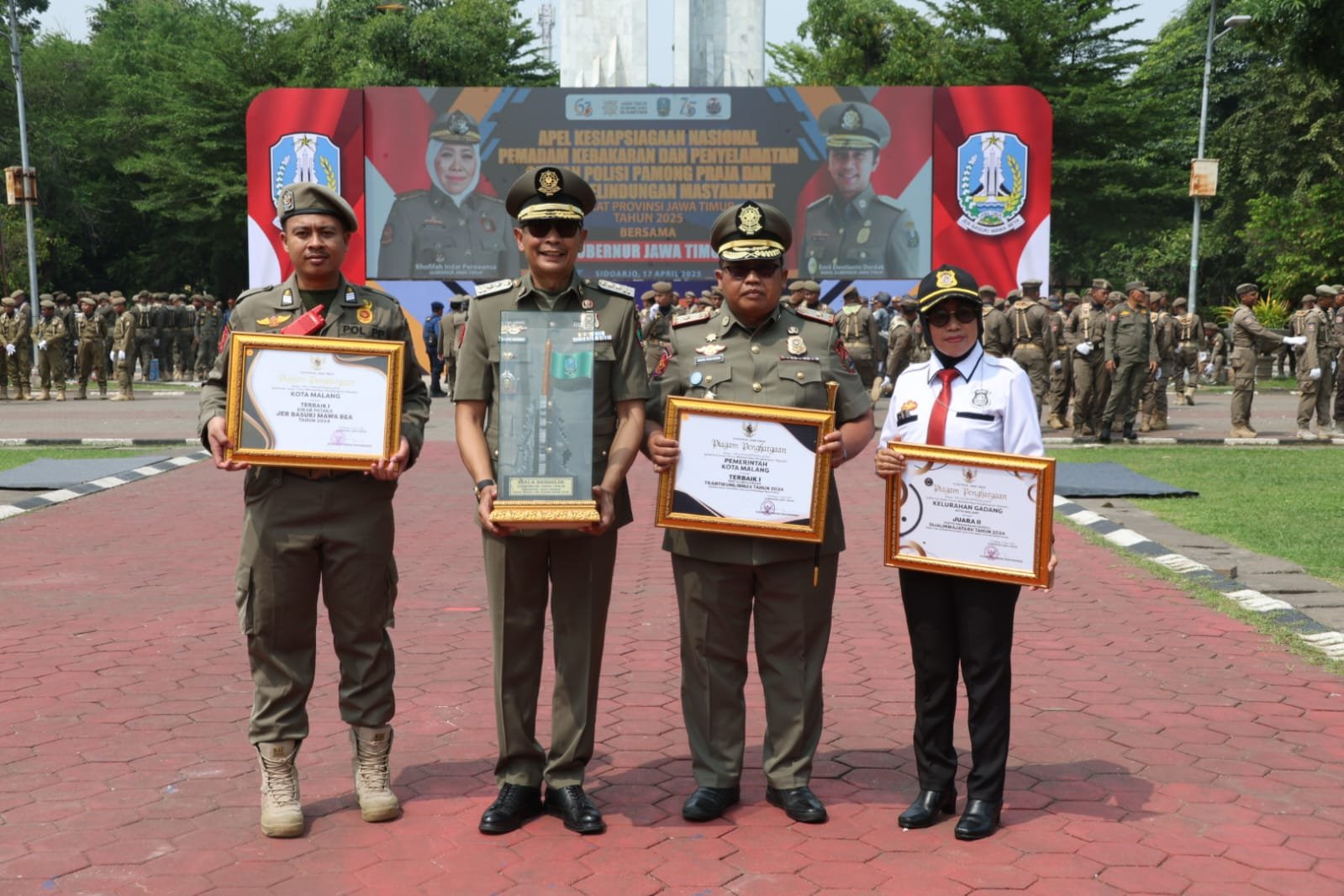 Walikota Malang, Dr. Ir. Wahyu Hidayat, MM bersama Kepala Satpol PP Kota Malang, Heru Mulyono berkesempatan menerima langsung ketiga penghargaan tersebut dari Gubernur Jawa Timur, Khofifah Indah Parawansa — saat menghadiri Apel Kesiapan Nasional Pemadam Kebakaran dan Penyelamatan Satpol PP dan Satlinmas Tingkat Provinsi Jawa Timur, di Alun-Alun Sidoarjo, Kamis (17/4/2025).