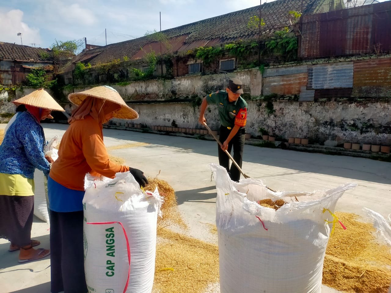 Babinsa Kedungkandang Sertu Sukarji bersama kelompok tani menjemur gabah agar kadar air turun sesuai standar kualitas gabah kering. Pengeringan ini menjadi tahap penting dalam menjaga mutu hasil panen agar bisa diserap oleh pasar maupun Bulog dengan harga yang menguntungkan petani.