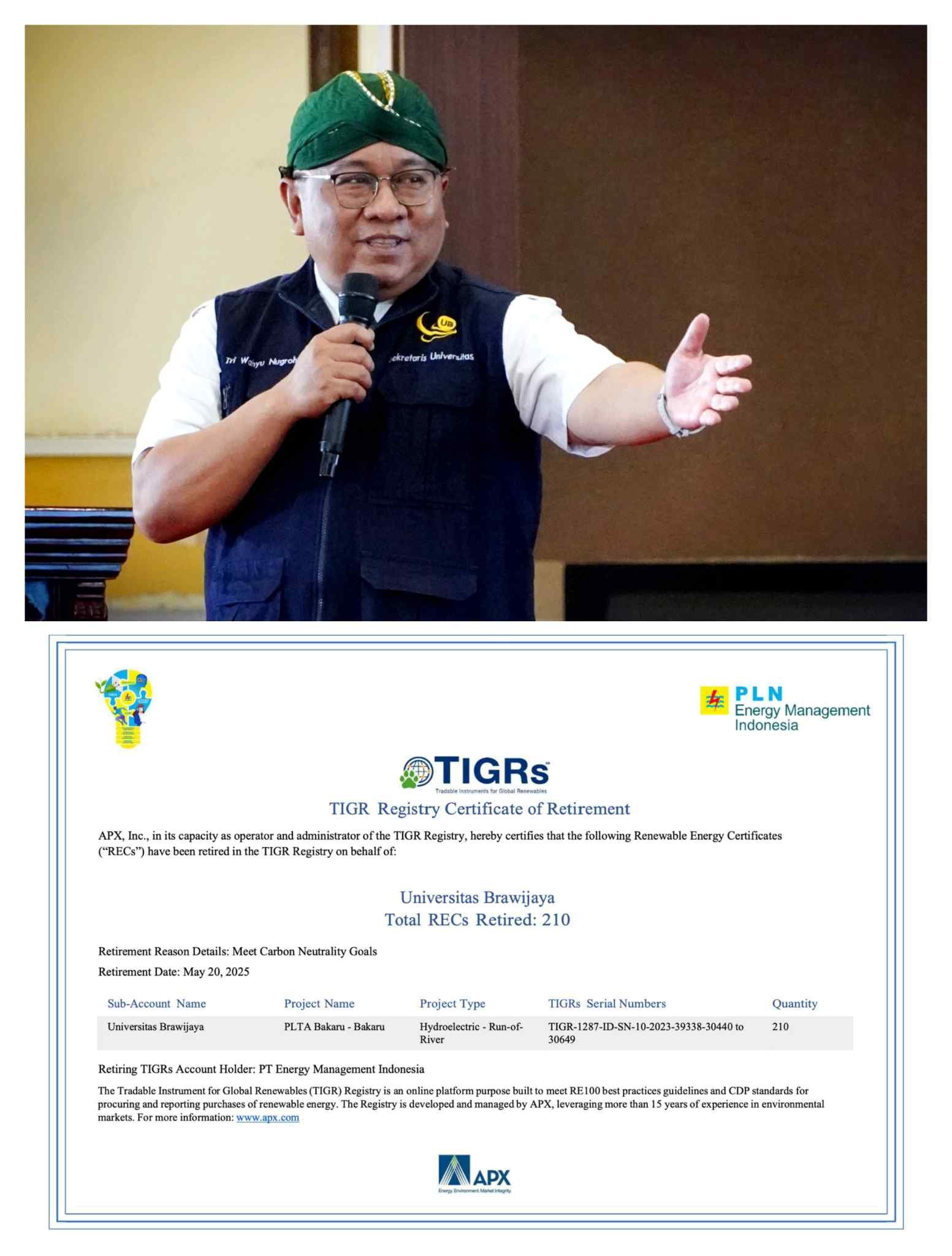 Sertifikat TIGR yang diperoleh UB difasilitasi oleh PLN melalui mekanisme Renewable Energy Certificate (REC) yang telah diakui secara internasional. REC ini dapat ditelusuri dan diperdagangkan secara global, serta digunakan oleh institusi yang ingin menunjukkan komitmennya terhadap penggunaan energi bersih.
