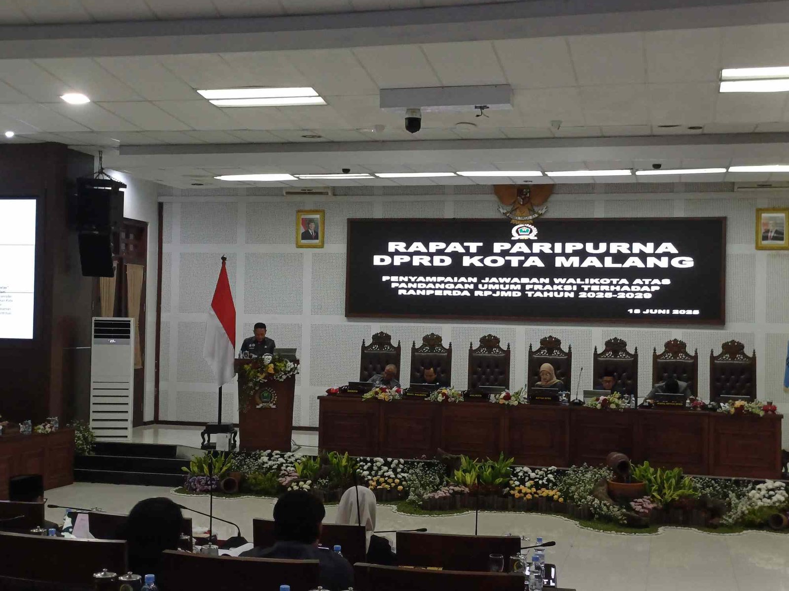 Malangpariwara.com – Rapat Paripurna DPRD Kota Malang, Rabu (18/6/2025), menjadi agenda, penyampaian jawaban Wali Kota Malang atas pandangan umum fraksi-fraksi terkait Rancangan Peraturan Daerah (Ranperda) tentang Rencana Pembangunan Jangka Menengah Daerah (RPJMD) Kota Malang tahun 2025-2029.