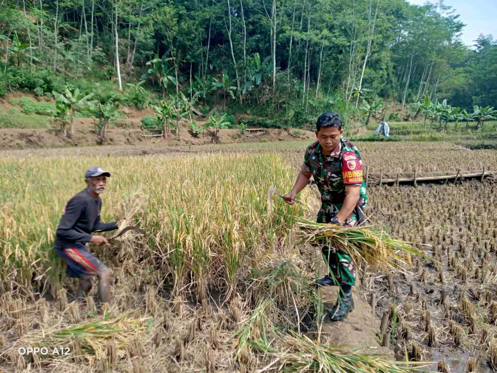 Dengan penuh semangat, Serda Irul membantu para petani memanen padi secara tradisional sembari memberikan motivasi agar para petani tetap menjaga kualitas gabah pascapanen.