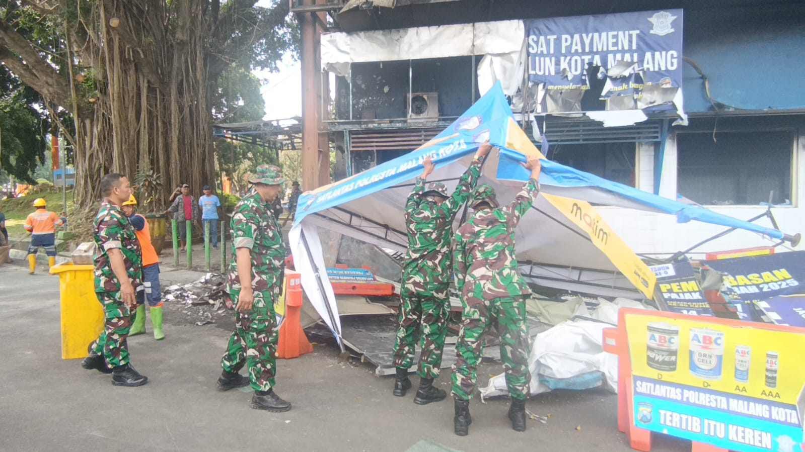 Malangpariwara.com – Kodim 0833/Kota Malang, bersama Polresta Malang Kota dan Dinas Lingkungan Hidup (DLH) Kota Malang, bergotong royong membersihkan sisa-sisa unjuk rasa di Pos Polisi Jl. Merdeka Barat No.9 Keluraha Kauman, Kecamatan Klojen, Kota Malang, Sabtu (30/8/2025).