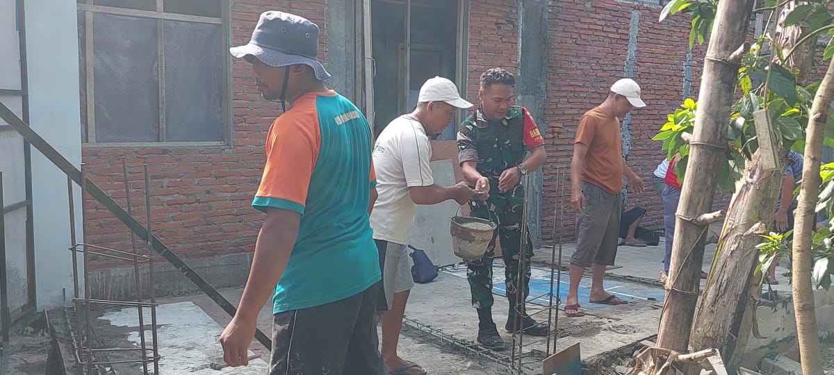 Serda Muis, Babinsa Kelurahan Arjosari bersama puluhan warga bahu-membahu mengangkat material, membongkar dinding, hingga meratakan tanah.