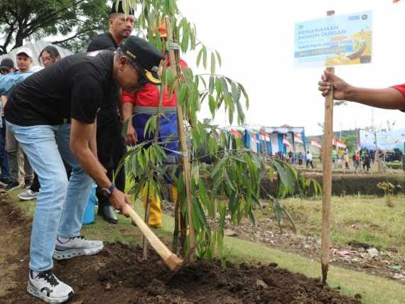 “Ini bertepatan dengan hari pahlawan 10 November. Kalau dulu pahlawan berjuang merebut kemerdekaan, maka perjuangan sekarang yaitu menanam pohon. Pohon-pohon ini untuk generasi yang akan datang,” ujar Wahyu, usai simbolis penanaman bibit durian, Senin (10/11/2025).