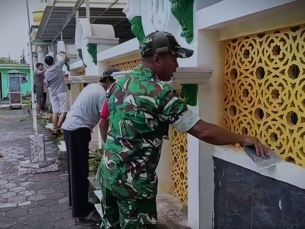 Babinsa tampak aktif bergotong royong mulai dari membersihkan area masjid hingga melakukan pengecatan dinding bangunan.
