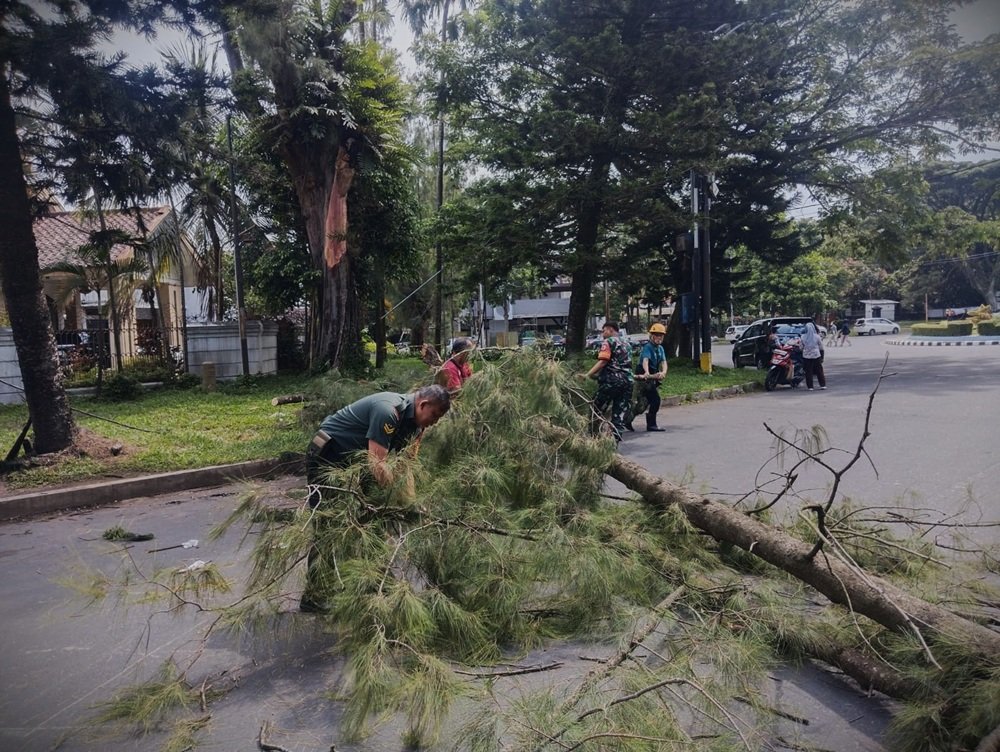 Pohon cemara berukuran setinggi ± 20 meter diameter ± 25 cm tersebut tumbang akibat akar pohon yang rapuh dan berpotensi membahayakan keselamatan pengguna jalan.